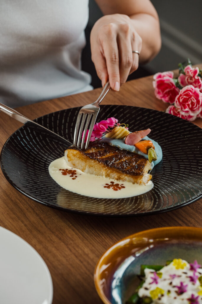 Botanico serves modern European cuisine with a focus on wood-fired and charcoal-grilled techniques. The Mother's Day Petals and Plates 4-course menu ($88++ per pax) features dishes such as wood-fired halibut with yuzu and ikura, Bincho-grilled Wagyu Picanha with smoked pumpkin purée and red wine yakiniku, and house-made cookies with raspberry sorbet — rustic in character and modern in execution.